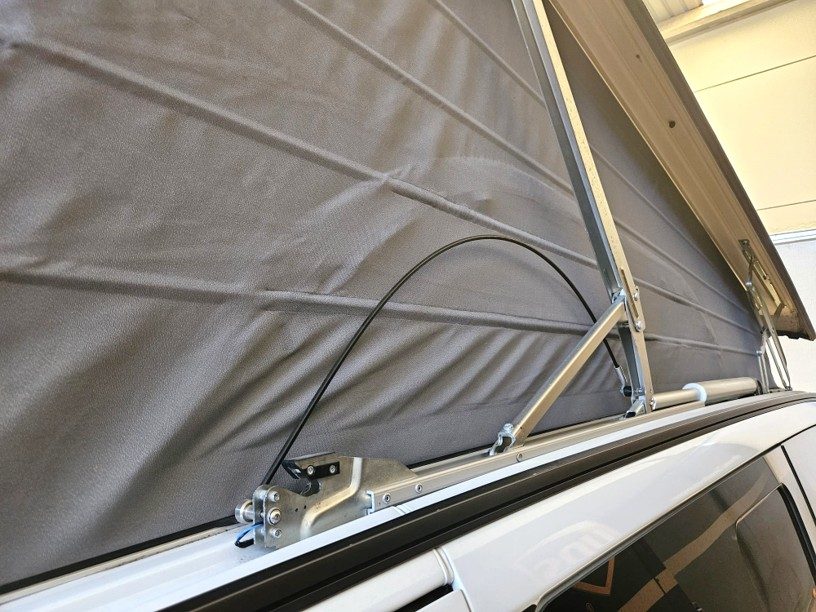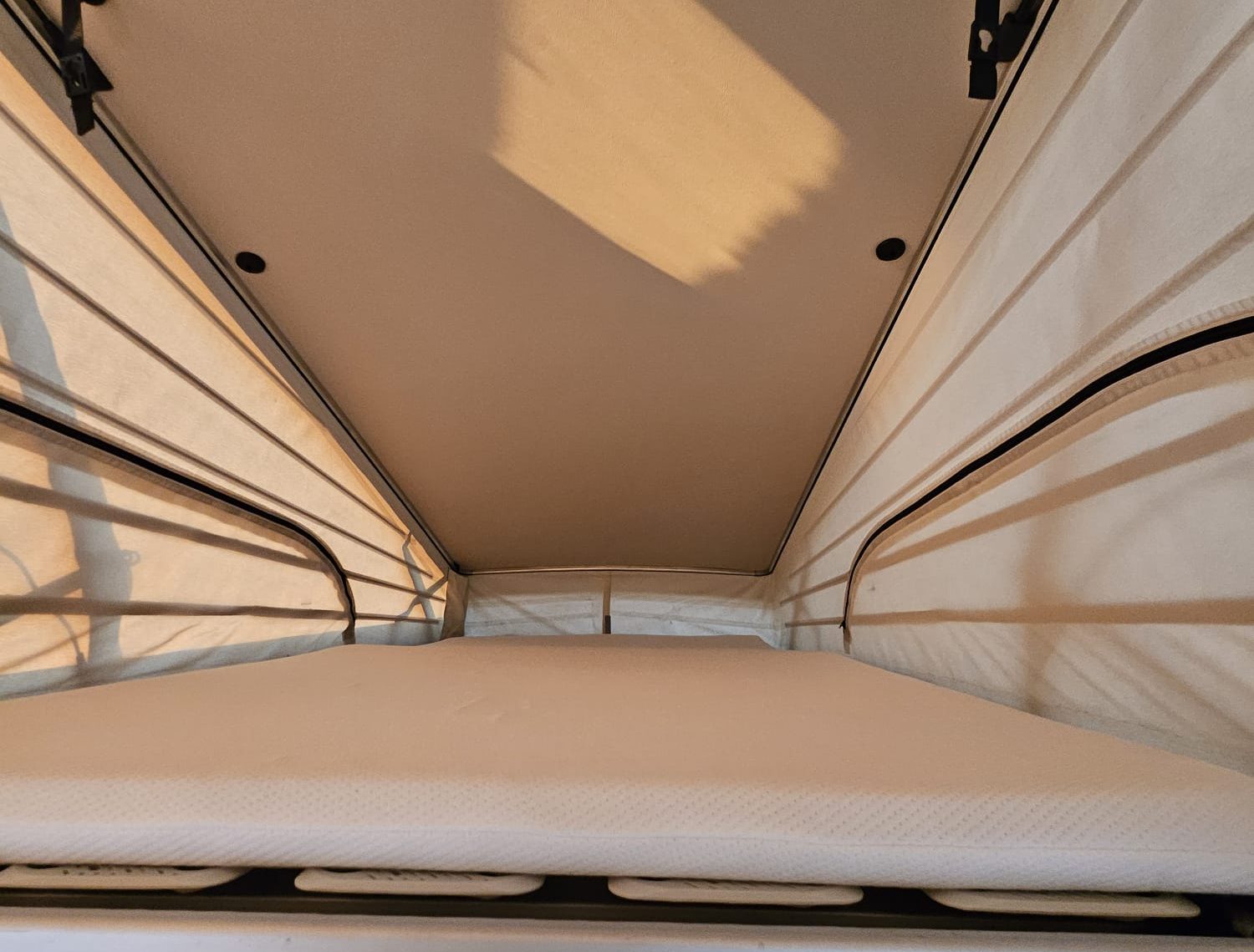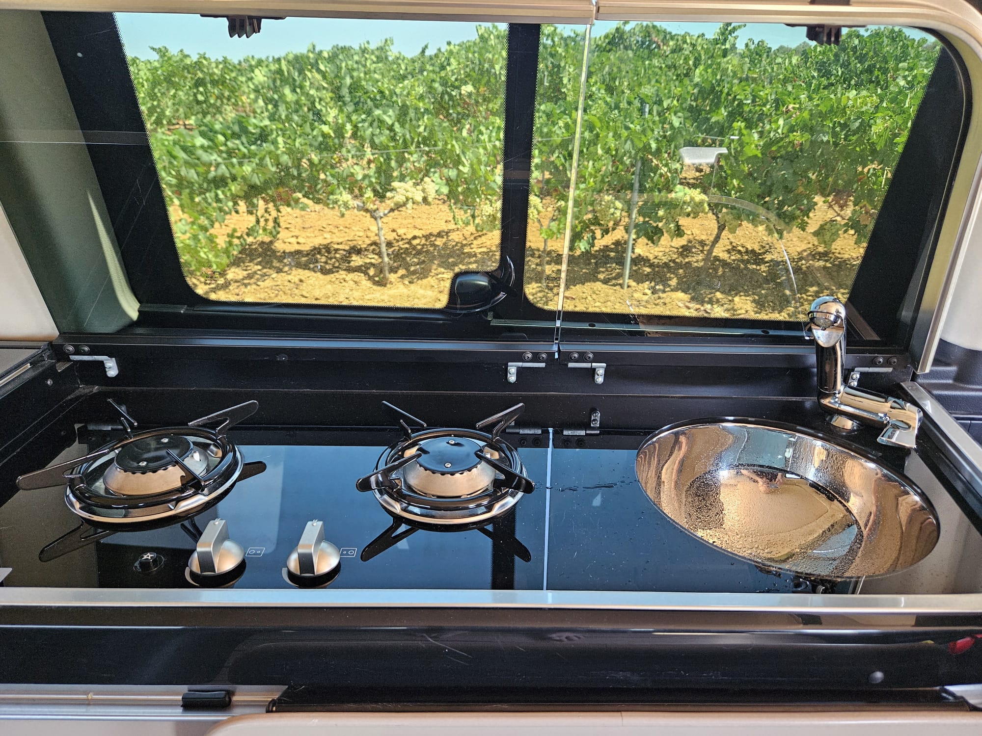 El techo eléctrico, la cama superior con somier y colchón, lavamanos, Cocina de dos fuegos, frigorífico - congelador, Mesita plegable, asientos eléctricos que conforman una segunda cama completa, la ducha exterior.... y todo esto con la máxima calidad y fiabilidad...